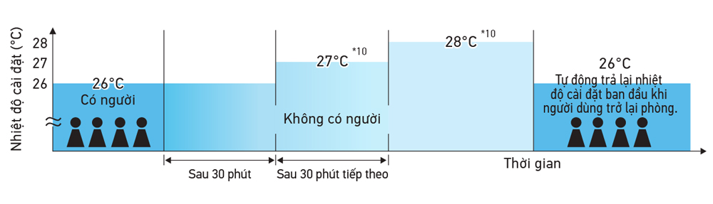 - Chế độ cảm biến ngưng hoạt động (mặc định: Tắt): Khi không có người trong phòng, hệ thống tự động ngưng hoạt động. Hệ thống tự động tiết kiệm năng lượng bằng cách nhận biết phòng có người hay không. Dựa trên điều kiện sử dụng được cài sẵn, hệ thống tự động ngưng hoạt động nếu phòng không có người. Thời gian ngưng hoạt động khi không có người có thể tùy chọn từ 1 đến 24 giờ với mức lũy tiến 1 giờ bằng điều khiển từ xa.