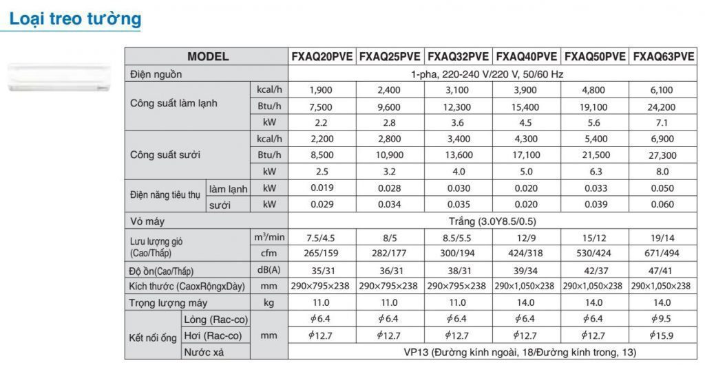 1. Thông số kỹ thuật dàn lạnh điều hòa trung tâm VRV FXAQ20PVE
